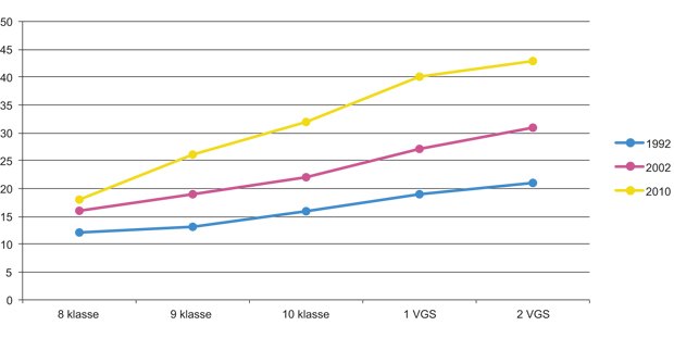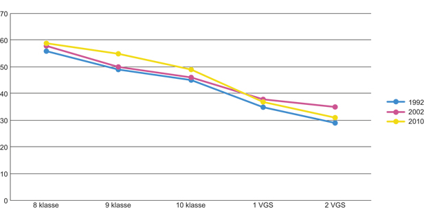 Figur 3.10 Prosentandel av norsk ungdom som trente i idrettslag på ulike klassetrinn i 1992, 2002 og 2010.