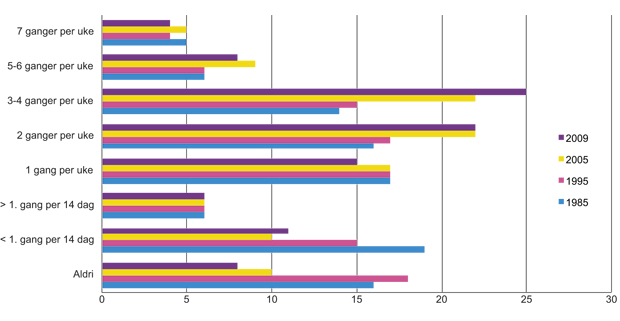 Tall fra Norsk Monitor viser også et generelt økende aktivitetsnivå fra 1985 til 2009. Mens det vanligste aktivitetsnivået i 1985 var sjeldnere enn hver fjortende dag (19 prosent) eller én gang per uke (17 prosent), er 3–4 ganger per uke (25 prosent) eller 2 ganger per uke (22 prosent) vanligst i 2009/2010.