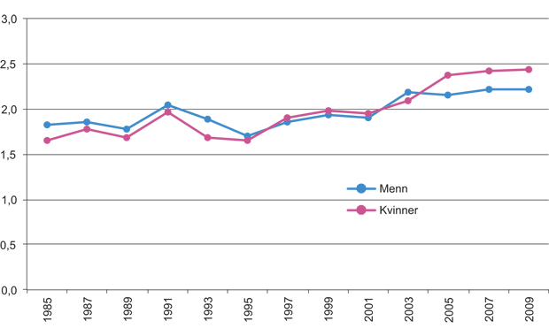 Utviklingen er litt ulik for kvinner og menn (figur 3.13). Kvinnene starter ut med et noe lavere snitt enn mennene, men ender opp litt høyere. Der kvinner i 1985 var litt mindre aktive en menn er forholdet motsatt i 2009. Kvinner har hatt en sterkere vekst enn menn i treningshyppighet per uke, og en større relativ økning i prosent.
