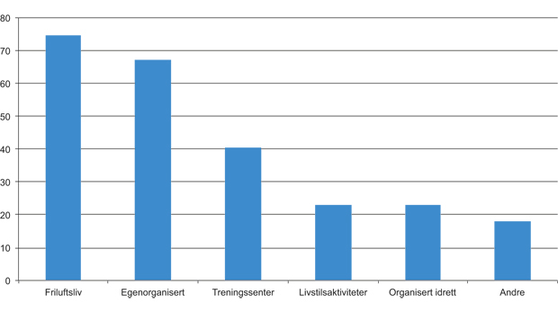 Norsk Monitor viser også at friluftsliv og egenorganisert aktivitet er de klart viktigste arenaene for fysisk aktivitet for voksne. Deretter følger kommersielle treningssentre og livsstilsaktiviteter. Når voksne oppgir sin arena for fysisk aktivitet på fritiden kommer idrettslag først på en femteplass.