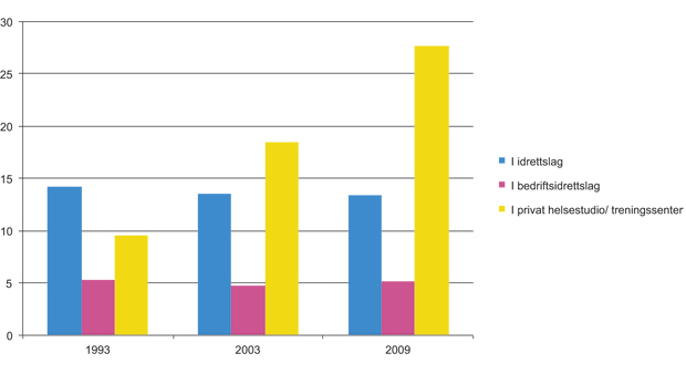 Et annet interessant utviklingstrekk er at ungdom i stadig større antall inntar de kommersielle treningssentrene. Tall fra NOVA viser at mens i overkant av 20 prosent av ungdommer i 2. klasse på videregående skole trente på treningssentre i 1992, er tilsvarende tall for 2010 drøyt 40 prosent.