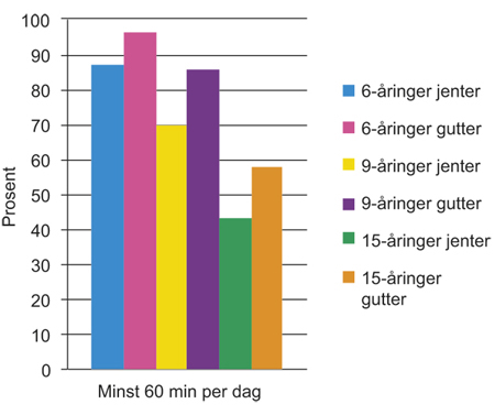 Ferske resultater fra en nasjonal kartlegging blant 6-, 9- og 15-årige jenter og gutter med bruk av aktivitetsmålere for å registrere fysisk aktivitetsnivå, viser at en større andel av dagen brukes til stillesitting i 2011 sammenlignet med i 2005/2006. En lavere andel oppfyller faglige anbefalinger om i gjennomsnitt minst 60 minutters daglig moderat fysisk aktivitet. Aktivitetsnivået synker kraftig fra 6 til 15 år. Blant 6 åringene er over 90 prosent av guttene og over 80 prosent av jentene i fysisk aktivitet mer enn 60 minutter per dag. Blant 9 åringene er tallene synkende og bare halvparten av 15-årige jenter og gutter er tilstrekkelig fysisk aktive. Kartleggingen bekrefter økende stillesitting også blant barn og ungdom. 15-årige gutter tilbringer størst andel av dagen – hele 70 % av tiden – og mer enn det pensjonister gjør – til stillesittende aktiviteter.