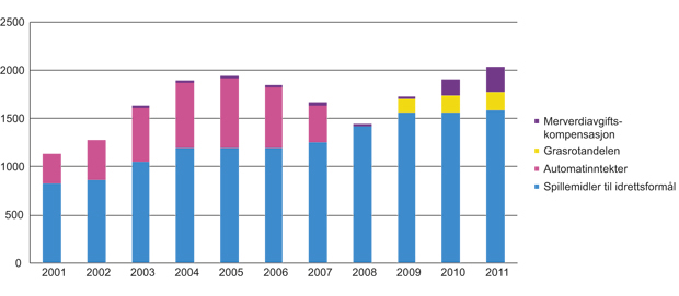 Summen av spillemidler, grasrotandelen og merverdiavgiftskompensasjon til idrett beløp seg i 2011 til over 2 milliarder kroner. Til sammenligning var summen av spillemidler og automatinntekter på drøyt 1,1 milliarder kroner i 2001.