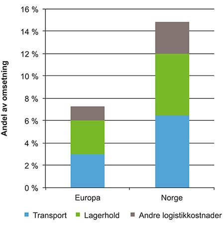 Figur 10.2 Transport- og logistikkostnader Europa og Norge 2008. Gjennomsnittlig andel av omsetningen.