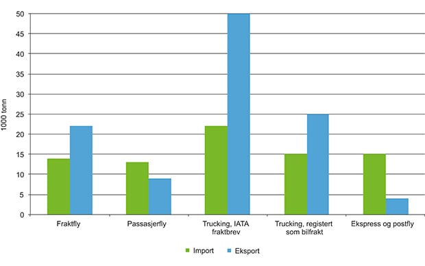 Registrert flyfrakt utgjør 0,1 pst. av importerte og eksporterte mengder, men utgjør hele 6 pst. av importerte og eksporterte verdier pga. høy enhetsverdi (kr/kg). Flyfrakt er i hovedsak interkontinentale transporter. Svært mye gods som faktisk er flytransport på hovedstrekningen, kjøres med lastebil over norsk grense på veg til/fra en større europeisk flyplass for flytransport derfra jf. figur 10.4. Retningsbalansen på lastebil (mer gods inn enn ut) og fly (mer ut enn inn) bidrar til mindre flyfrakt fordi prisene er lave ut av landet. Et bedre tilbud av interkontinentale ruter fra Oslo lufthavn, Gardermoen, kunne gitt mer direkte flyfrakt fra Norge. Avinor arbeider aktivt for å legge til rette for dette. Internasjonalt øker flyfrakt med ca. 5 pst. per år.