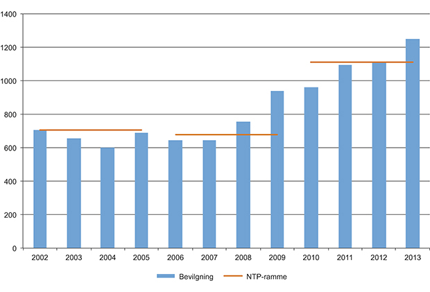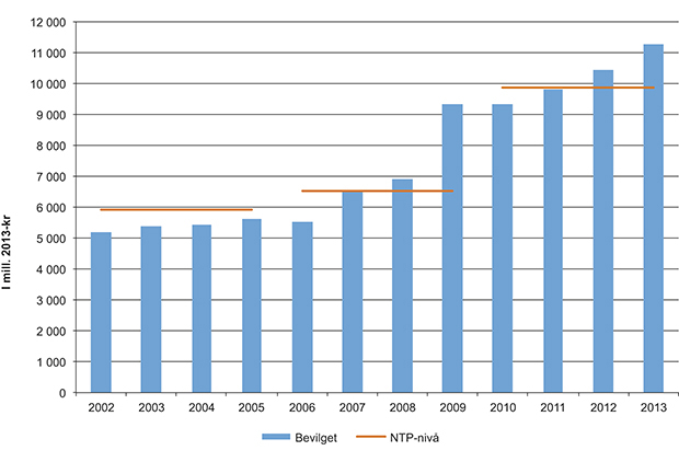 Figur 2.2 viser at årlig rammenivå for Statens vegvesen for perioden 2010–2013 er over 6 mrd. kr høyere enn for perioden 2002–2005. I perioden fra 2002 til 2013 har bevilgningene til veginvesteringer økt med 105 pst., mens bevilgningene til drift og vedlikehold har økt med 56 pst. Figur 2.3 viser at årlig rammenivå til jernbaneinfrastruktur for perioden 2010–2013 er 4 mrd. kr høyere enn perioden 2002–2005. Bevilgningene til drift og vedlikehold for jernbane er 37 pst. høyere i 2013 enn i 2002, mens bevilgningene til jernbaneinvesteringer er mer enn fire ganger større i samme periode. Planrammen for Kystverket økte med om lag 400 mill. kr fra perioden 2002–2005 til perioden 2010–2013. Oppfyllingsgraden totalt for transportformene i perioden 2010–2013 er 99,3 pst.