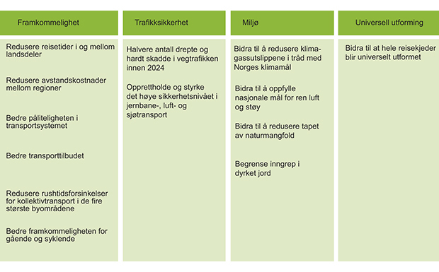 Hovedmålene for transportpolitikken peker framover mot en ønsket tilstand for transportsektoren, uten å være tid- eller tallfestet: