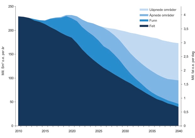 Gjennom en bevisst og samtidig satsing i hele denne kjeden vil en kunne opprettholde produksjonen fra næringen på et meget høyt nivå i tiår framover. Det mulige produksjonsforløp som er illustrert i figur 1.1, er høyere enn myndighetenes forventning med en videreføring av dagens politikk. Dette skyldes at den tar inn over seg ekstra muligheter som ligger både i felt, funn og innen leting. Anslaget ligger godt innenfor den usikkerheten som ligger i Oljedirektoratets anslag for gjenværende, utvinnbare ressurser på norsk sokkel.