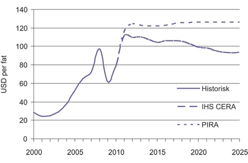 Det er noe forskjell i syn mellom ulike analysemiljøer når det gjelder oljeprisens utvikling framover, jf. figur 3.10. PIRA antar eksempelvis en gradvis stigende realpris på olje opp til om lag 125 USD per fat i 2025, tilsvarende en nominell markedspris på ca 175 USD per fat. IHS CERA antar på sin side en realpris på olje på mellom 100 og 110 USD per fat fram til 2020, med en avtagende tendens fra 2015.
