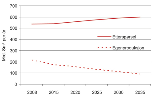 EU-landene bruker omtrent 500 mrd. Sm3 gass i året, eller om lag fem ganger norsk produksjon. I perioden 2000 og 2008 var den gjennomsnittlige årlige etterspørselsveksten i EU-landene to pst. Den økonomiske tilbakegangen i 2008 og 2009 førte til at etterspørselen etter gass falt med omtrent seks pst. Det er ventet at gassetterspørselen kommer tilbake på 2008-nivå i løpet av de nærmeste årene.