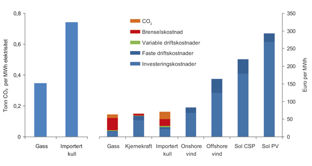 Figur 3.13 CO2-utslipp for gass- og kullbasert kraftgenerering(t.v.), langsiktig grensekostnad for kraftgenerering i Europa(t.h.)1.