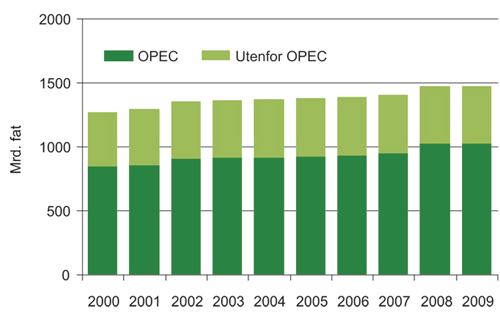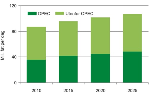 OPEC-landene vil da måtte dekke mesteparten av etterspørselsveksten. 2/3 av verdens oljeressurser antas å befinne seg i land som er medlem i OPEC. Disse landene står i dag for om lag 40 pst. av oljeproduksjonen. Ressursbasen i landene gir grunnlag for en betydelig produksjonsøkning utover dagens nivå. Rikelig tilgang på ressurser er ingen garanti for stabil vekst i produksjonen. Flere av de store ressurslandene i OPEC har vært eller er politisk ustabile. Historisk har kriger og konflikter vært hyppige i Midtøsten og ført til periodevis ustabil og avtagende oljeproduksjon og påvirket landenes evne til å bygge opp ny produksjonskapasitet. Budsjettbegrensinger kan også påvirke landenes muligheter til å bygge ut ny kapasitet, ved at kapital til investeringer i oljeutvinning må konkurrere med andre behov i landene. De omfattende urolighetene i regionen i år har ført til stans i oljeeksporten fra Libya og kraftig oppgang i oljeprisene.