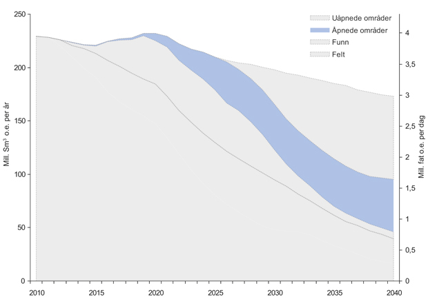 I framtida forventes store deler av produksjonen å komme fra funn som ennå ikke er påvist. Fra 2020 vil viktigheten av ressurser som gjenstår å finne bli gradvis større og etter hvert dominerende. En nødvendig forutsetning for å opprettholde produksjonsnivået er at lønnsomme funn gjøres. Dette forutsetter at letenivået i åpent areal opprettholdes.