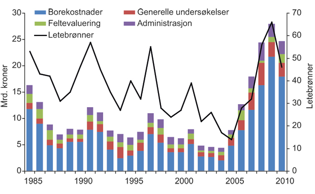 Figur 5.10 Letekostnader og antall letebrønner, 1985 – 2010.