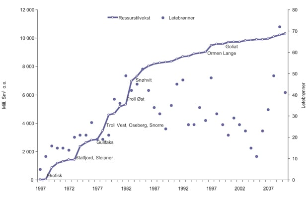Figur 5.2 Akkumulert ressurstilvekst over tid samt antall letebrønner boret per år.