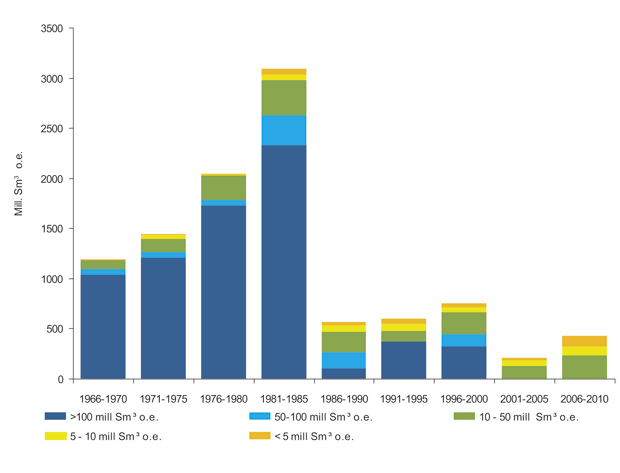 Den gjennomsnittlige funnstørrelsen avtar etter hvert som petroleumsprovinser modnes. Dette gjelder også for områdene på norsk kontinentalsokkel. De første 20 årene ble det gjort flere særdeles store funn på norsk sokkel, og flere av disse feltene produserer fortsatt store volumer. Fra midten av 1980-tallet har ikke reservetilveksten vært like stor. Med unntak av Ormen Lange, ble de største funnene påvist i tidsrommet fra 1969 til 1984. På 1990-tallet avtok størrelsen på funnene og antall letebrønner ble færre, jf. figur 5.2.