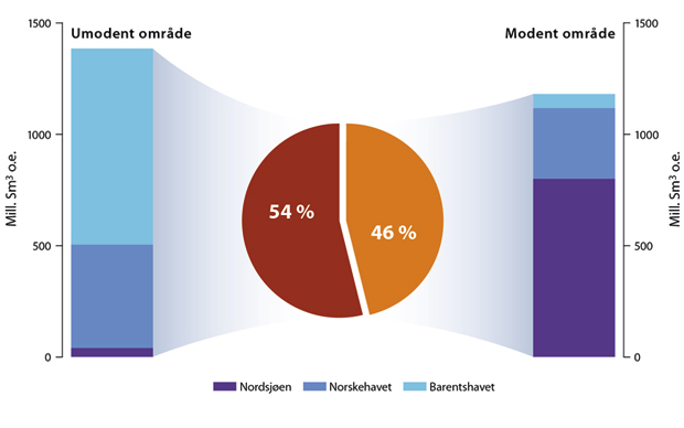 Store volumer og verdier er fortsatt til stede i modne områder. Oljedirektoratet anslår at nesten halvparten av de uoppdagede ressursene finnes i modent område, jf. figur 5.4. Det meste av disse ressursene forventes å være i små funn i Nordsjøen. Størstedelen av Nordsjøen er omfattet av TFO-området og er dermed definert som modent område. Potensialet i umodent område av Nordsjøen er derfor begrenset. Det største potensialet i umodne områder ligger i Barentshavet og deretter i Norskehavet. Dette reflekteres også i den nylig avsluttede 21. konsesjonsrunde, der alt tildelt areal er i Norskehavet og i Barentshavet.