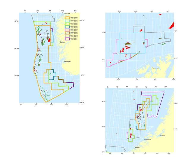 I tråd med St. meld. nr. 38 (2003 – 2004), Om petroleumsvirksomheten, utvides TFO-området gradvis i takt med at nye områder blir modne. En slik gradvis utvidelse er gjennomført siden 2003, jf. figur 5.5. I første TFO-runde, TFO 2003, inngikk primært areal i Nordsjøen og ved Haltenbanken i Norskehavet. Områdene rundt Snøhvit i Barentshavet ble inkludert fra og med TFO 2004. Det er foretatt utvidelse av TFO-området i alle år siden etablering av ordningen unntatt i 2009.