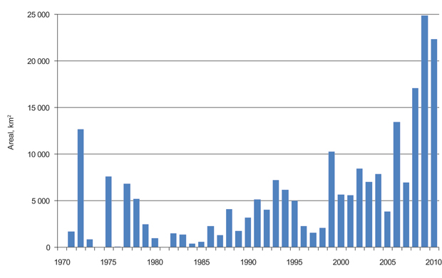 Oljedirektoratets analyse viser at om lag en til to pst. av alt tildelt areal er brakt. Omfanget av brakt areal anses derfor som beskjedent. Omfanget forventes å bli ytterligere redusert som følge av arealavgiften. Tilbakelevert areal har økt betydelig de siste par årene, jf. figur 5.6. Dette skyldes antagelig innføring av ny arealavgift i 2007. Myndighetene ønsker å følge denne utviklingen før eventuelle andre tiltak igangsettes.