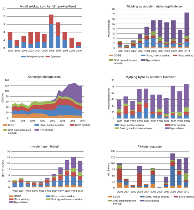Fra 2007 har investeringene i leting fra nye selskaper økt markant. I 2007 investerte disse selskapene nesten seks mrd. kroner i leting. I 2009 var det økt til over ni mrd. kroner. De siste tre årene har nye selskaper samlet investert nærmere 27 mrd. kroner i leting. I 2010 sto de nye små selskapene for 40 pst. av leteinvesteringene. Statoil, og staten gjennom SDØE, investerer fortsatt betydelig i leting, og har hatt en økning de siste årene. De store etablerte selskapene har hatt relativt jevn investeringstakt de siste årene.