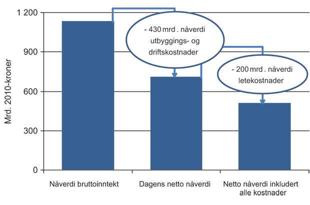 Nåverdien av alle kostnader knyttet til leting på norsk sokkel i samme periode er 200 mrd. kroner. Dette gjelder både vellykket leting og leting som ikke har påvist utvinnbare ressurser. Tar en også med disse historiske kostnadene i beregningen er verdiskapingen fra leting i perioden 2000 – 2010 drøyt 500 mrd. kroner. Dette viser at leteaktiviteten siden 2000 har vært lønnsom.