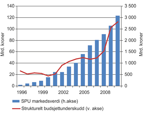 Figur 9.1 Strukturelt, oljekorrigert budsjettunderskudd og markedsverdien av Statens pensjonsfond utland. Oljekorrigert budsjettunderskudd er et mål for bruken av petroleumsinntekter over statsbudsjettet.