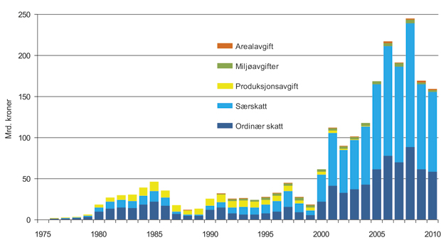 Netto kontantstrøm fra petroleumsvirksomheten var i 2010 på 276 mrd. kroner. Av dette utgjorde ordinær overskuddskatt og særskatt fra selskapene med virksomhet på norsk sokkel om lag 156 mrd. kroner. Ettersom skatteleggingen er overskuddsbasert er det nær sammenheng mellom olje- og gasspris og skatteproveny.