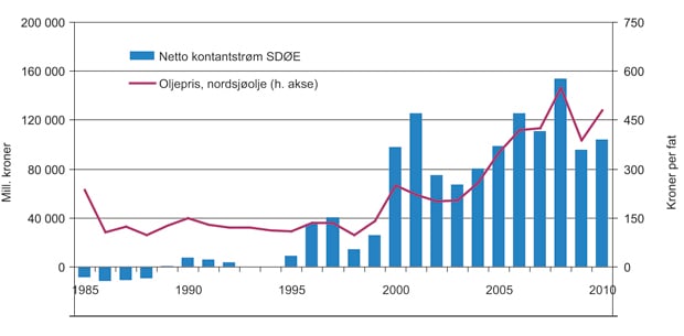 Figur 9.4 Netto kontantstrøm fra SDØE og oljepris (løpende kroner).