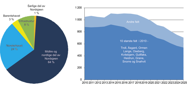 Staten har forbeholdt seg store andeler i det som i dag er lønnsomme felt med stor produksjon. Størsteparten, om lag 85 pst., av produksjonen kom i 2010 fra de ti feltene Troll, Åsgard, Ormen Lange, Oseberg, Kvitebjørn, Gullfaks, Heidrun, Grane, Snorre og Snøhvit. Disse feltene anslås også å stå for 75 pst. om 15 år, jf. figur 9.5.