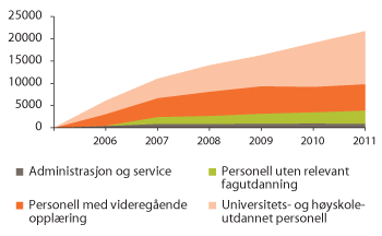 Samlet har årsverksveksten hittil i regjeringsperioden (2005–2011) vært på om lag 22 000 årsverk. Om lag 80 prosent av veksten har bestått av personell med helse- og sosialfaglig utdanning. Dette har gitt en økning i andelen personell med helse- og sosialfaglig utdanning i helse- og omsorgssektoren fra 66,4 prosent i 2005 til 69,1 prosent i 2011, og bidratt til å styrke både kapasiteten og kompetansen i tjenestene.