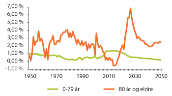 Figur 3.13 Prosentvis årlig endring i antall personer over og under 80 år 1950–2050