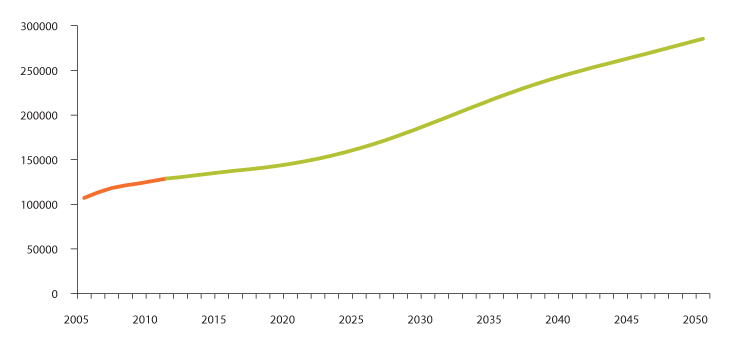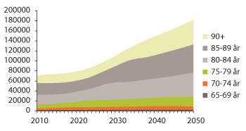 Antall personer over 67 år vil mer enn fordobles fra 2000 til 2050. Antall personer 80 år og eldre kan komme til å øke fra 190 000 i 2000 til nesten 350 000 i 2030 og nesten 570 000 i 2050. Veksten i aldersgruppen 80–89 år vil finne sted først om ti år. For gruppen 90 år og eldre skjer det allerede en kraftig vekst de nærmeste årene.
