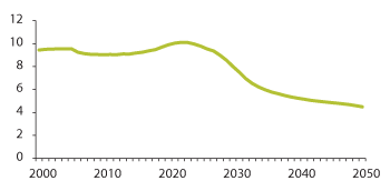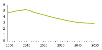 Figur 3.15 Antall personer i yrkesaktiv alder (16–66 år) per antall eldre i gruppen 67 år og mer (Koeffisienten for aldersbæreevne) 2000–2050