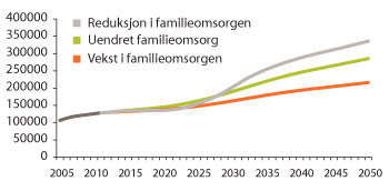 På grunnlag av Statistisk sentralbyrås tidsbruks- og levekårsundersøkelser er det anslått at familieomsorgen har holdt seg noenlunde stabil på om lag 100 000 årsverk de siste tiårene, men med en mindre nedgang fra 1990 til 2000 (Rønning m.fl. 2009). Dette betyr at omfanget av årsverk fra familie og uformelt sosialt nettverk ikke øker i takt med omsorgsbehovet i befolkningen, og at det sannsynligvis er urealistisk å påregne at den vil vokse i takt med veksten i omsorgsbehovet i årene som kommer. De demografiske forutsetningene ligger heller ikke til rette for det. Veksten i omsorgsbehov må derfor i hovedsak løses på andre måter. Det blir samtidig viktig å opprettholde, styrke og vedlikeholde den ressursen omsorgen fra familie og frivillige utgjør i møte med framtidas omsorgsutfordringer.