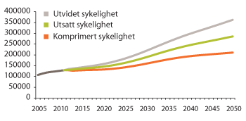 Framskrivningen i figur 3.17 bygger på en av mange mulige forutsetninger om graden av utsatt sykelighet, og en antakelse om at lavere dødelighet blant eldre skyldes bedre helse. Dette slår ut i lavere aldersspesifikk bruk av omsorgstjenester, slik at tiden med relativt mye sykdom og funksjonstap blir omtrent den samme som før. Dette innebærer at en 75-åring i 2050 vil ha en forventet bedre helse og et mindre behov for omsorgstjenester enn en 75-åring i 2010. En forutsetning om utsatt sykelighet kan være noe optimistisk i lys av Global Burden of Disease Study 2010, men ivaretar samtidig funn om en forbedring i eldres evne til å klare seg bedre i hverdagen. For planleggingsformål velger en samlet sett å legge forutsetningen om utsatt sykelighet til grunn.
