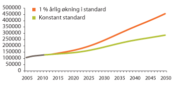 Figur 3.21 illustrerer virkningen av en prosent årlig standardøkning, og viser at krav og forventninger om økte ressurser over tid vil kunne ha betydelige konsekvenser for personellbehovet i omsorgssektoren.