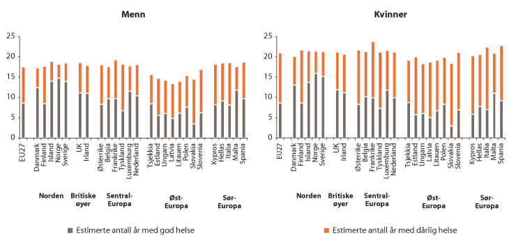 Figur 3.23 viser forventet gjenstående levealder for en 65-åring i et utvalg land i Europa i 2011, med estimat for gjenstående år med god og dårlig helse. Figuren viser at Norge både er blant de som lever lengst i Europa og har færrest år med dårlig helse på slutten av livet.