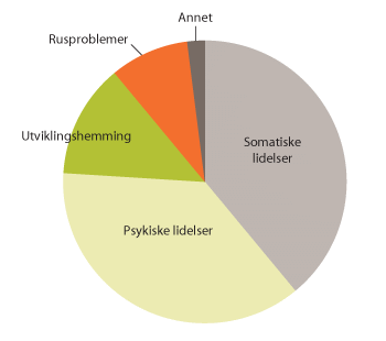 Helsemessig består gruppen hjemmetjenestemottakere under 67 år av to større og to mindre grupper (Romøren 2006). Den største gruppen er mennesker som har en av mange ulike somatiske lidelser (39 prosent), blant disse dominerer nevrologiske tilstander som MS, hjerneslag, hode- og ryggskader. Psykiske lidelser er også en stor gruppe (37 prosent). De to mindre gruppene er mennesker med utviklingshemming (13 prosent) og personer med rusproblemer (9 prosent). Brukergruppen under 67 år mottar i hovedsak hjemmetjenester og svært få bor i institusjon. Mange av disse tjenestemottakerne får sitt tilbud fra hjemmetjenesten og dagaktivitetstilbud i samme omfang som i sykehjem, målt i timetall. Flere av dem er på skole eller arbeid på dagtid. I hvilken grad økningen i antall yngre tjenestemottakere vil fortsette i årene framover er vanskelig å forutsi. Det er grunn til å anta at veksten vil flate ut, eller stabilisere seg, uten at det er grunnlag for å angi når. For videre planlegging er det av stor betydning å få mer forskningsbasert kunnskap om dette.