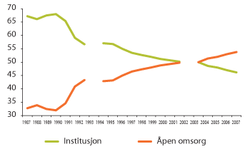 Figur 3.6 Andel årsverk i pleie- og omsorgssektoren i prosent, fordelt på institusjon og åpen omsorg 1987–2007