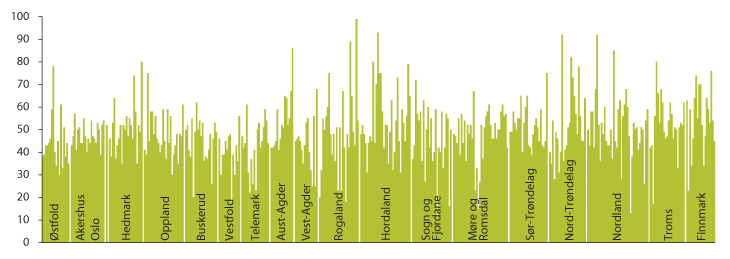 Kommunene har ansvar for å sørge for nødvendige og forsvarlige tjenester som møter den enkeltes behov. Den enkelte kommune avgjør selv hvordan tjenestene skal organiseres ut fra lokale forhold og behov. Som figur 3.7 viser er det store variasjoner i hvordan kommunene har organisert sine helse- og omsorgstjenester. I 20 prosent av kommunene brukes under 40 prosent av omsorgstjenestenes netto driftsutgifter til institusjon, og mer enn 60 prosent på hjemmetjenester og institusjonsdrift. I ti av disse kommunene er institusjonsandelen under 20 prosent. På den andre siden bruker 15 prosent av kommunene over 60 prosent av utgiftene til institusjon, hvorav 11 kommuner har en institusjonsandel på 80 prosent eller mer. Nesten to tredeler av kommunene har imidlertid en institusjonsandel på 40–60 prosent, og landsgjennomsnittet var i 2011 på 46 prosent.