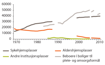 I perioden fra 1965 til 1980 ble antall mottakere av hjemmesykepleie mer enn tredoblet fra 24 000 til 75 000 mottakere. Mottakere av hjemmehjelp økte enda mer, fra vel 13 000 i 1965 til vel 98 000 femten år senere. Tallet på mottakere av hjemmesykepleie og hjemmehjelp fortsatte å vokse på 80-tallet, men i en lavere takt enn i det foregående tiåret. Hjemmetjenestene har på 2000-tallet blitt mer og mer konsentrert om de som har det største hjelpebehovet. Blant annet er andelen brukere som bare mottar praktisk hjelp sunket fra nesten halvparten til en fjerdedel av tjenestemottakerne. Antall beboere i institusjon økte fram til rundt 1990, da ansvaret for sykehjemmene ble overført fra fylkeskommunene til kommunene og institusjonene i Helsevernet for psykisk utviklingshemmede ble avviklet. Siden har antallet beboere i ulike institusjoner gått ned, samtidig som mottakere av hjemmetjenester og omsorgsboliger har hatt betydelig vekst.