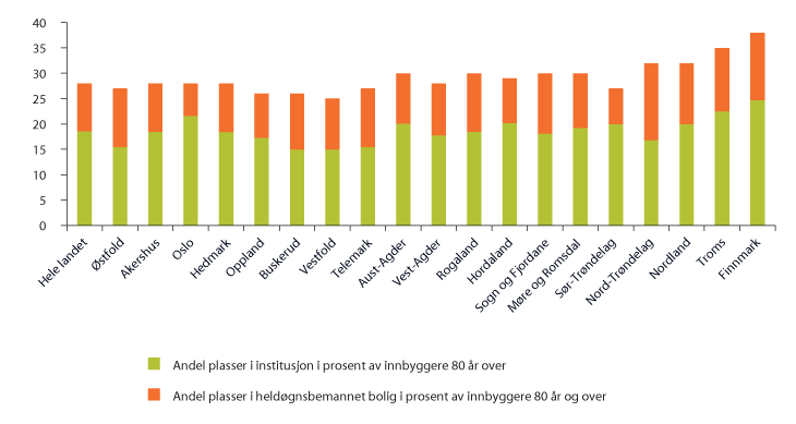 Det er stor variasjon i hva slags boformer kommunene benytter til mennesker med behov for heldøgns tjenestetilbud. Figur 3.9 viser at de fire nordligste fylkene har høyest samlet heldøgns dekningsgrad (heldøgns omsorgsplasser i prosent av eldre 80 år og over), men mens Finnmark har høy sykehjemsdekning, har Nord-Trøndelag høy dekning av heldøgnsplasser i omsorgsboliger. I Østfold, Buskerud og Telemark er også omsorgsboligandelen høy, mens sykehjemsandelen er høyest i Oslo og Sør-Trøndelag, som foreløpig har svært få omsorgsboliger. Dekningsgraden for hele landet er 28 heldøgns omsorgsplasser i prosent av befolkningen 80 år og over, hvorav 18,5 plasser er i sykehjem.
