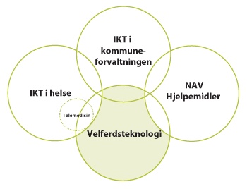 Helsedirektoratet har i sin fagrapport om implementering av velferdsteknologi (Helsedirektoratet 2012) også brukt denne definisjonen. Velferdsteknologi har grenseflater mot, og kan være overlappende med IKT i helse og kommuneforvaltningen og hjelpemiddelområdet. I denne meldingen omhandles velferdsteknologi med sikte på at dette skal bli en integrert del av tjenestetilbudet i omsorgstjenesten.
