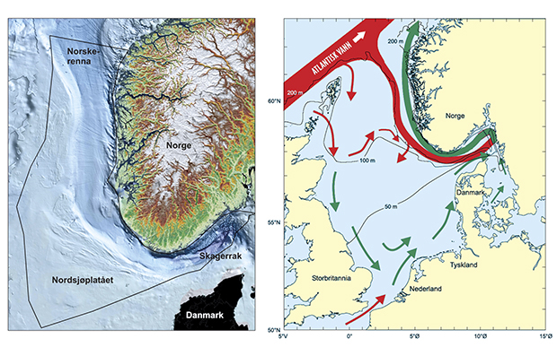 Nordsjøen er stort sett et grunt havområde med største dyp i den nordlige delen av Nordsjøen på noe over 100 meter. Norskerenna skiller vår kyst fra de grunnere partiene mot vest og syd. Norskerenna er formet med en bratt skråning til de dypeste partiene rett utfor kysten, for deretter å ha en svak stigning opp til Nordsjøplatået i vest og syd. Norskerenna har sitt dypeste område på over 700 meter i Skagerrak syd for Arendal. Et grunnere område utenfor Jæren avgrenser de dypere partiene i Skagerrak fra den nordlige delen av Norskerenna.