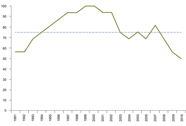 Figur 3.13 Andel av 16 sjøfuglarter i Nordsjøen i perioden 1991–2010 som oppfylte OSPAR-konvensjonens økologiske kvalitetsmål for sjøfuglbestander. Målet er ikke nådd i år der andelen ligger under 75 %. (Vertikal akse viser prosentandel av arter som oppfyller mål for bestandsnivå)