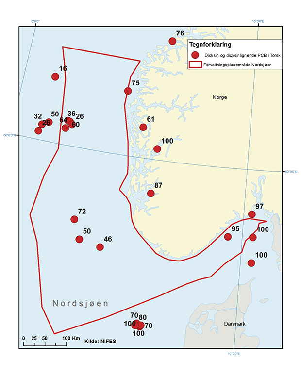Miljøgifter kan utgjøre en risiko for mennesker gjennom konsum av sjømat. Nivåene av miljøgifter i sjømat fra Nordsjøen og Skagerrak er generelt lave, men likevel noe høyere enn i Norskehavet og Barentshavet. Innholdet av enkelte stoffer i noen få arter gir likevel grunn til bekymring. En relativt høy andel av torsken i forvaltningsplanområdet har nivåer i lever som overskrider den øvre grenseverdien for summen av dioksiner og dioksinlignende PCB (polyklorerte bifenyler) i lever. Også nivåene av ikke-dioksinlignende PCB-forbindelser i torskelever overskrider den øvre grenseverdien for mattrygghet i en god del av torsken fra Nordsjøen og Skagerrak. Nivåene ser ut til å være høyere i Skagerrak enn i Nordsjøen.