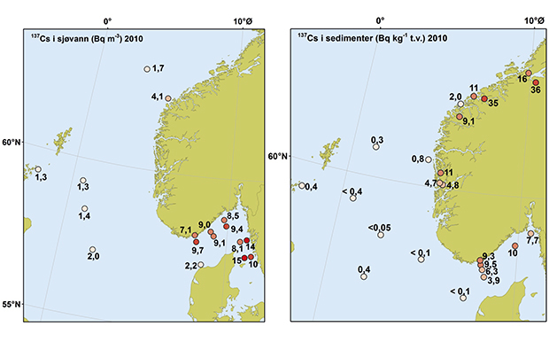 Figur 3.6 Kartene angir nivåene av cesium-137 i sediment og sjøvann fra Nordsjøen og Skagerrak i 2010