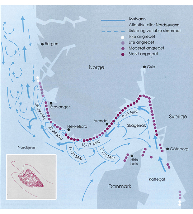 Figur 3.8 Utbredelsesområdet for algeoppblomstringen. Tegning av algen er innfelt.