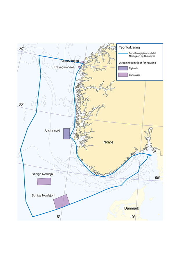 Etter en helhetlig vurdering har NVE anbefalt å prioritere åpning av totalt fem områder i norske havområder, hvorav fire av områdene ligger i Nordsjøen (figur 4.11). Dette er områdene Frøyagrunnene, Utsira Nord og Sørlige Nordsjø I og II. Statnett vurderer at bare ett av de to områdene Sørlige Nordsjø I og II kan knyttes til nettet innen 2025. NVE mener at disse fire områdene i Nordsjøen skiller seg ut som områder med svært gode teknisk-økonomiske forhold og de samlede konsekvenser for miljøet og andre næringer er vurdert som akseptable.