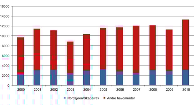 Andelen av fangstverdi i Nordsjøen og Skagerrak sett i forhold til andre norske havområder har variert fra år til år i perioden 1990–2010, men i gjennomsnitt ligget på 25 %. For fangstmengde er tallet 23 %, noe som viser at utbyttet fra bestandene i øvrige havområder er noe lavere enn i Nordsjøen og Skagerrak. Andelene av total fangstmengde har også vist en fallende tendens det siste tiåret, og det skyldes først og fremst økningen i fangstmengde fra de store bestandene i Barentshavet de siste årene.